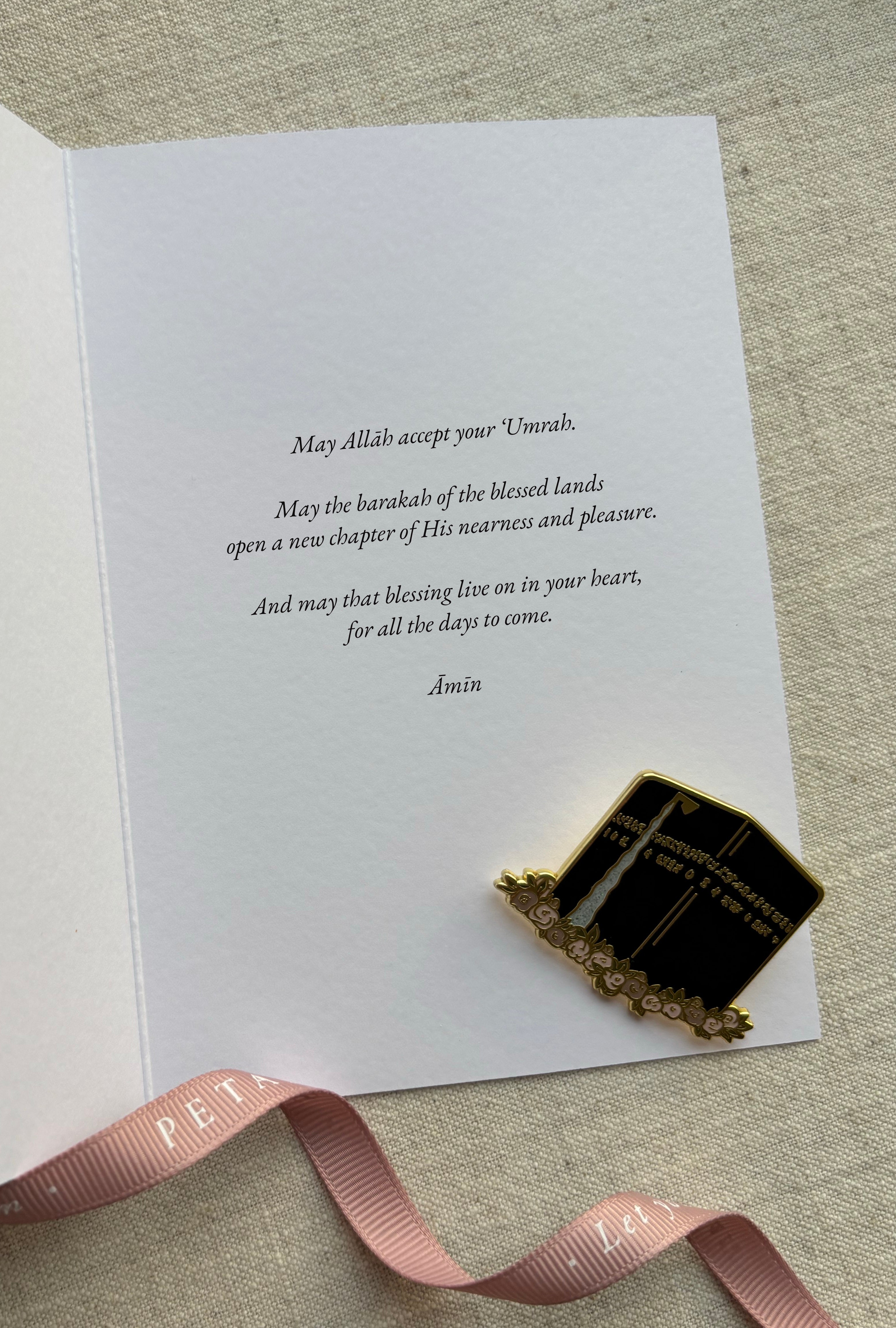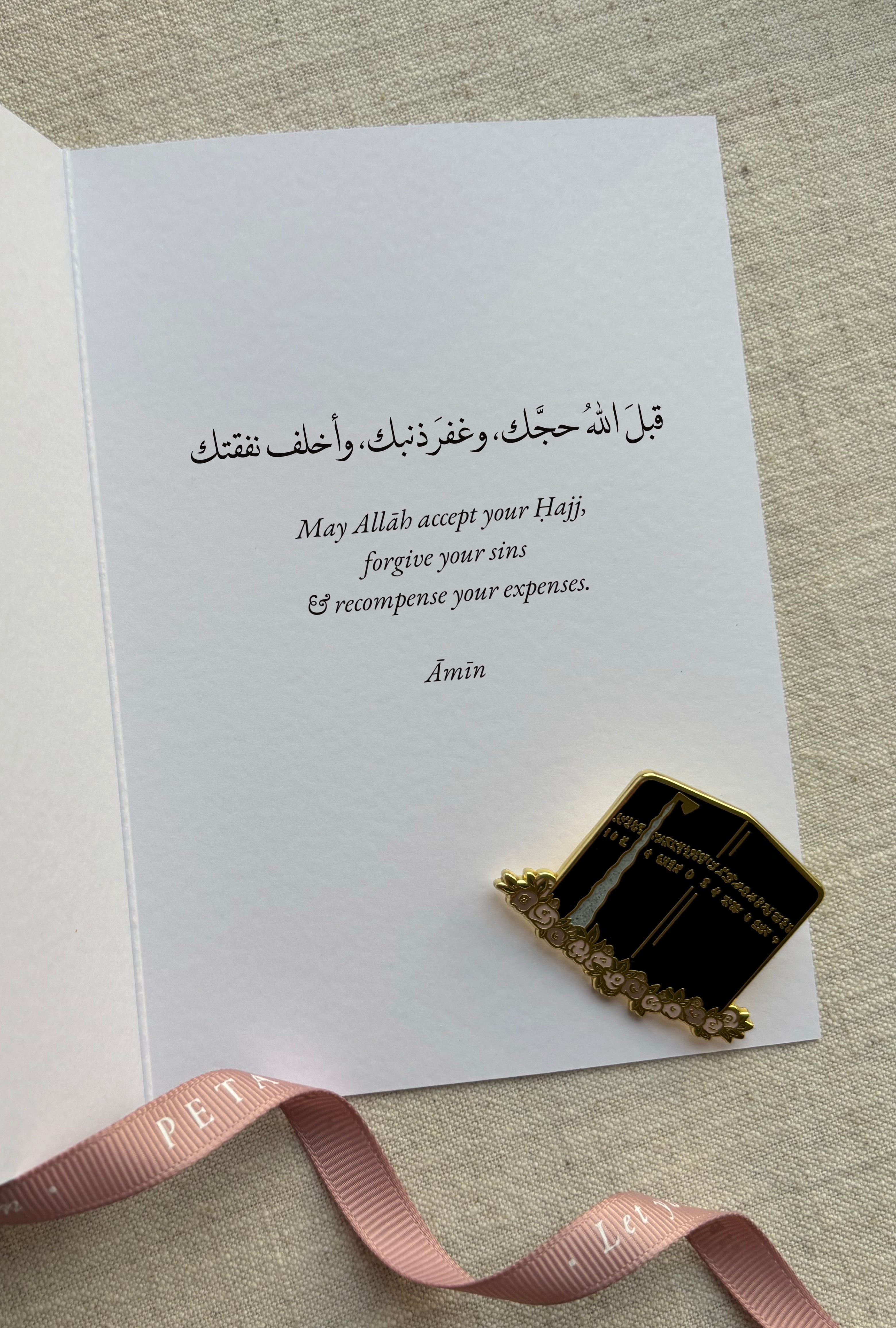 A gold-plated enamel pin featuring the Holy Kabah, framed by a soft floral design that reflects beauty & mercy,. Paired with a matching illustrated greeting card, it’s a heartfelt gift for Hajj, Umrah, Eid - or anyone beginning a sacred journey. Choose a printed dua inside, or leave it blank for your own words.