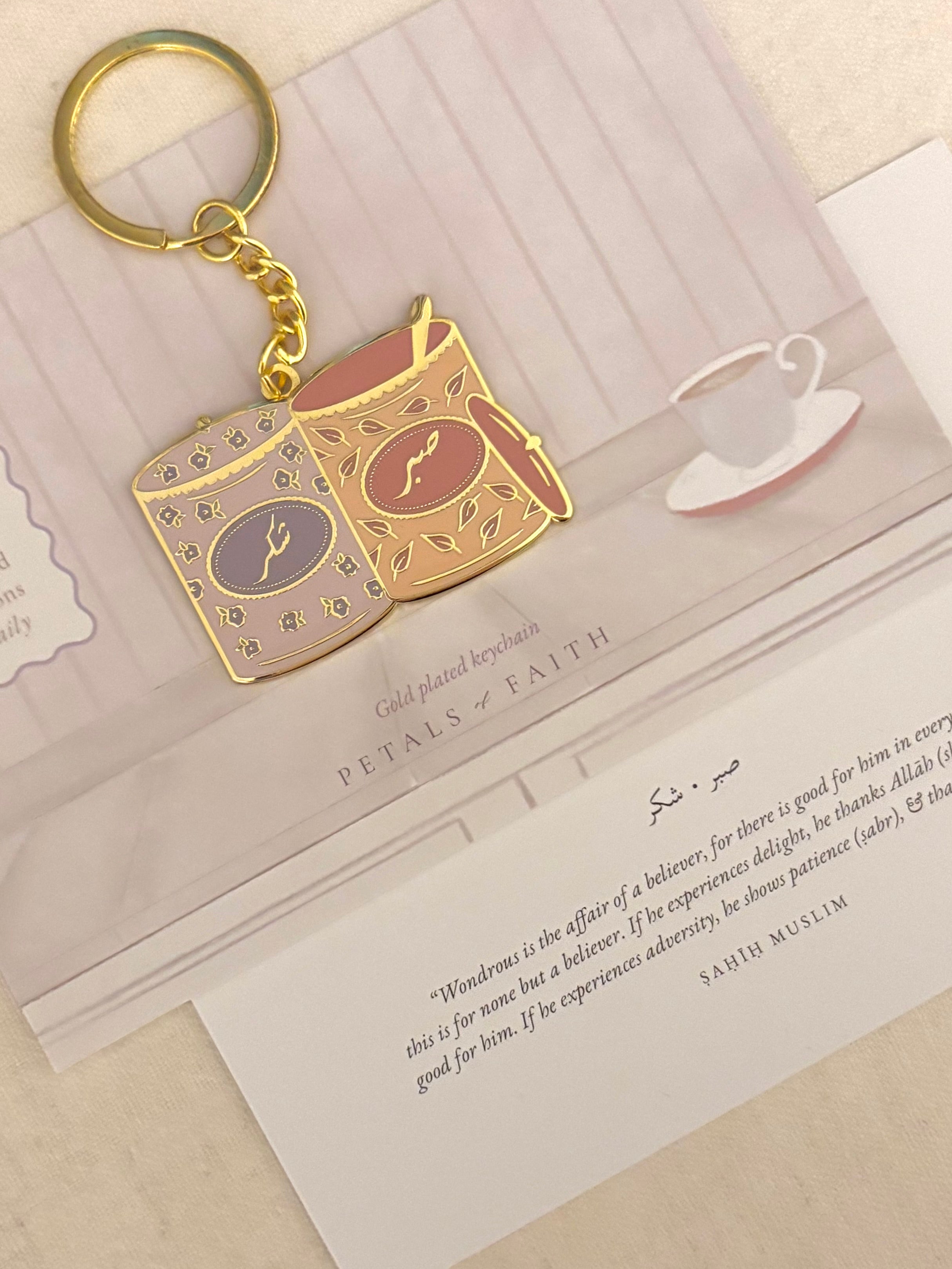 A charming enamel keyring featuring two mini jar charms labelled Sabr and Shukr, in soft lilac and peach with a smooth gold-plated finish. Mounted on a playful illustrated backing card that reads “Take two heaped spoons daily”, this sweet kitchen-themed reminder encourages daily patience and gratitude.