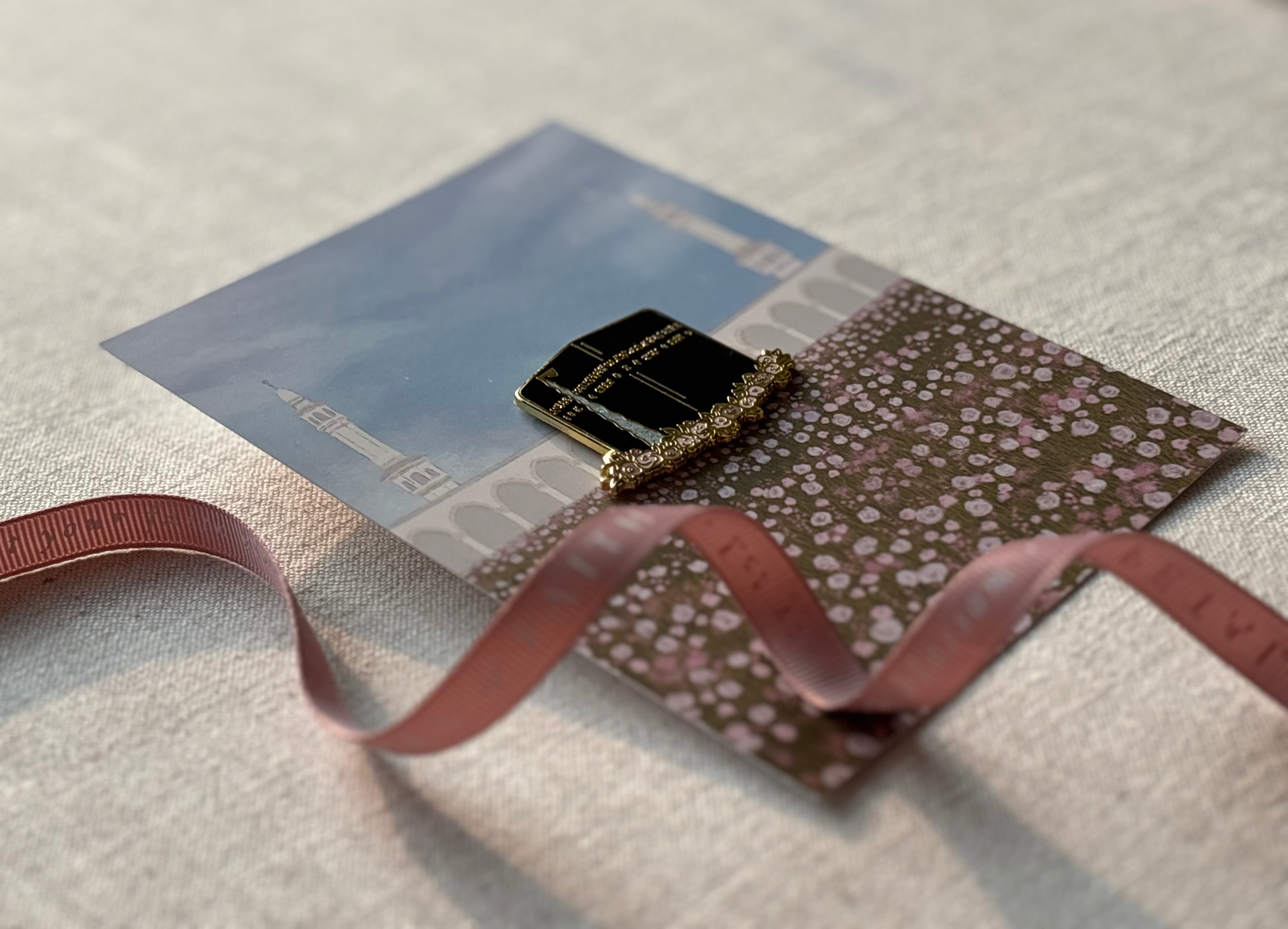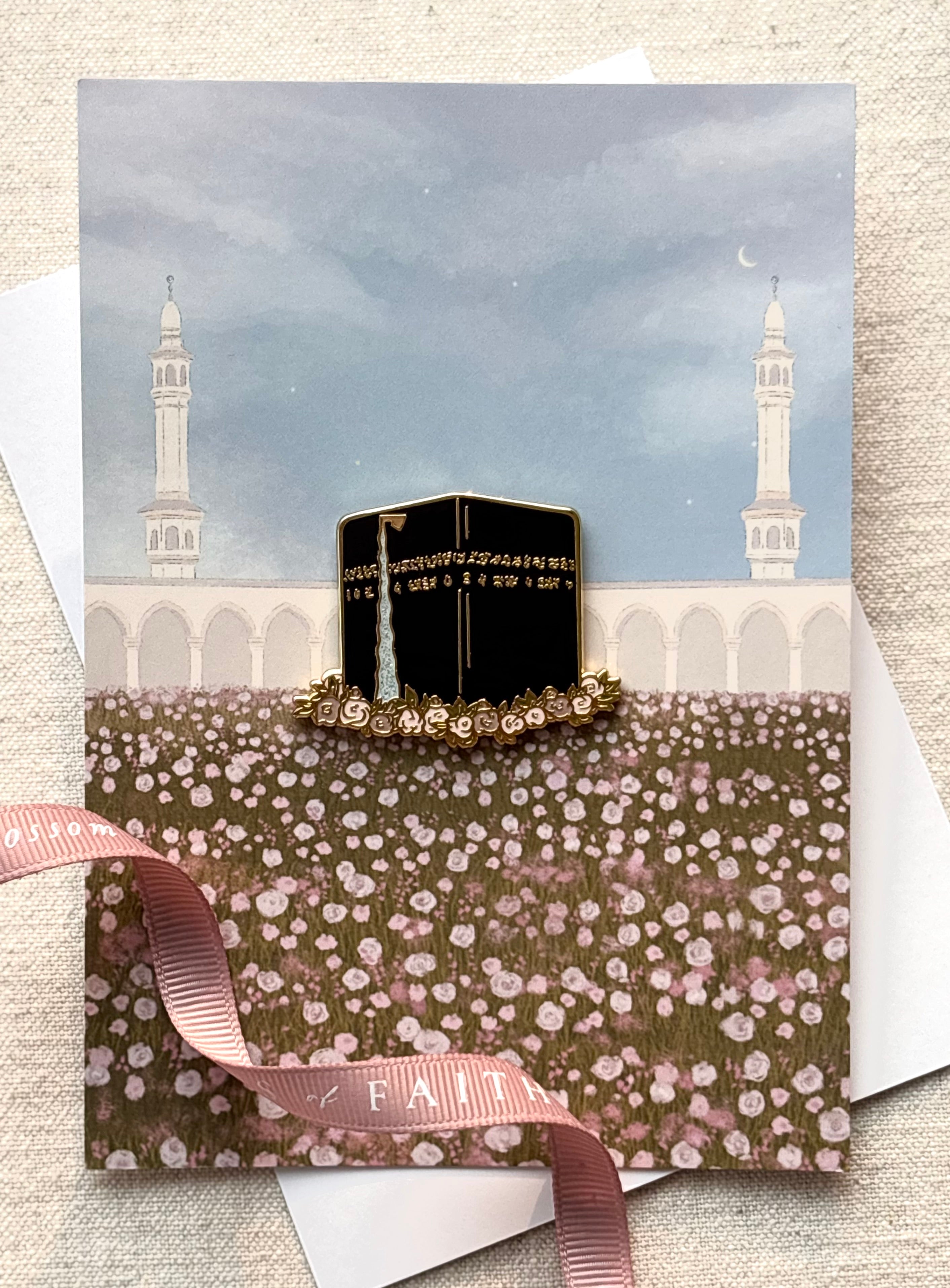 Kabah Enamel Pin Badge with A6 backing card– Islamic Gift & Keepsake | Glitter & Floral Design