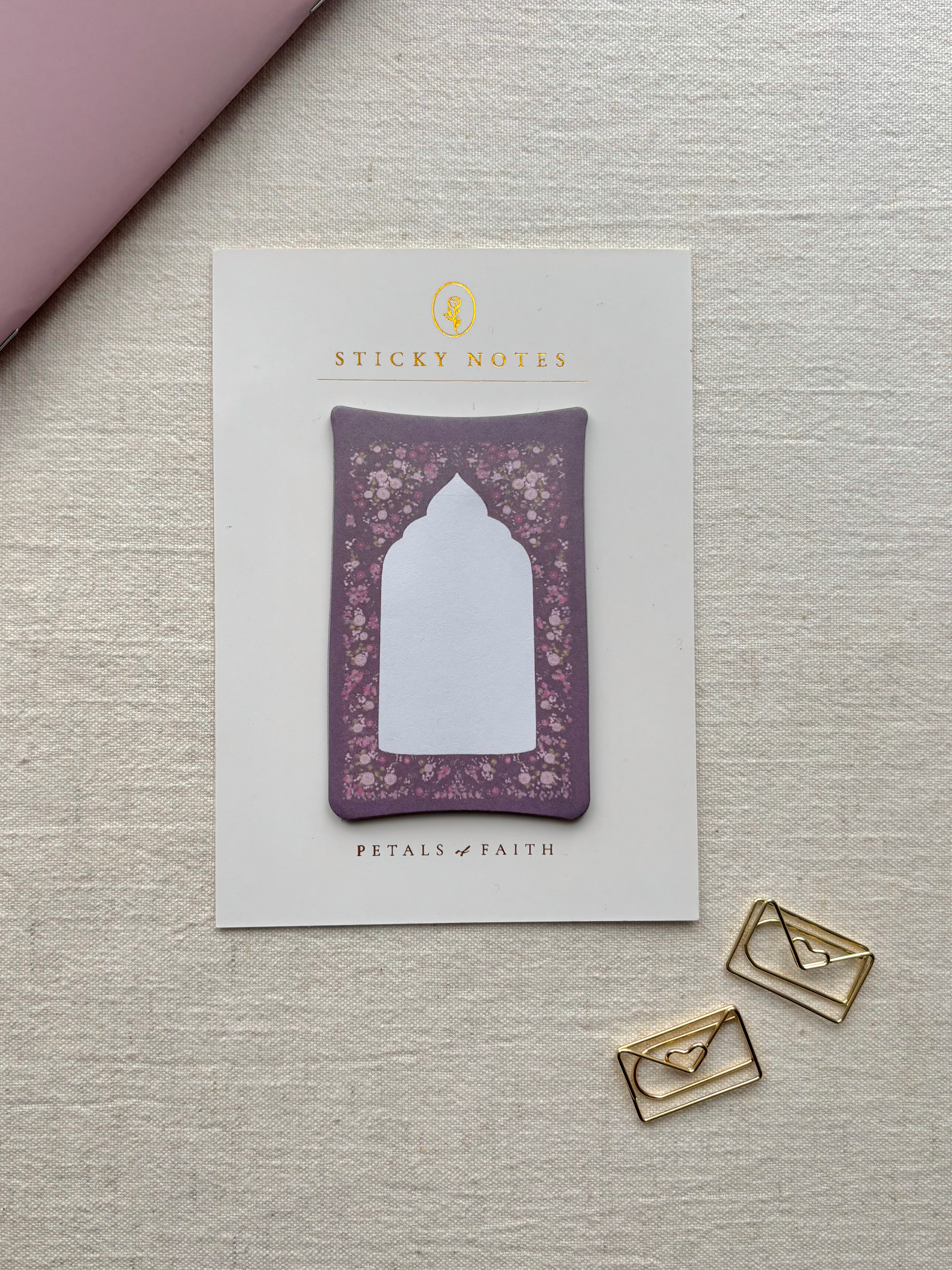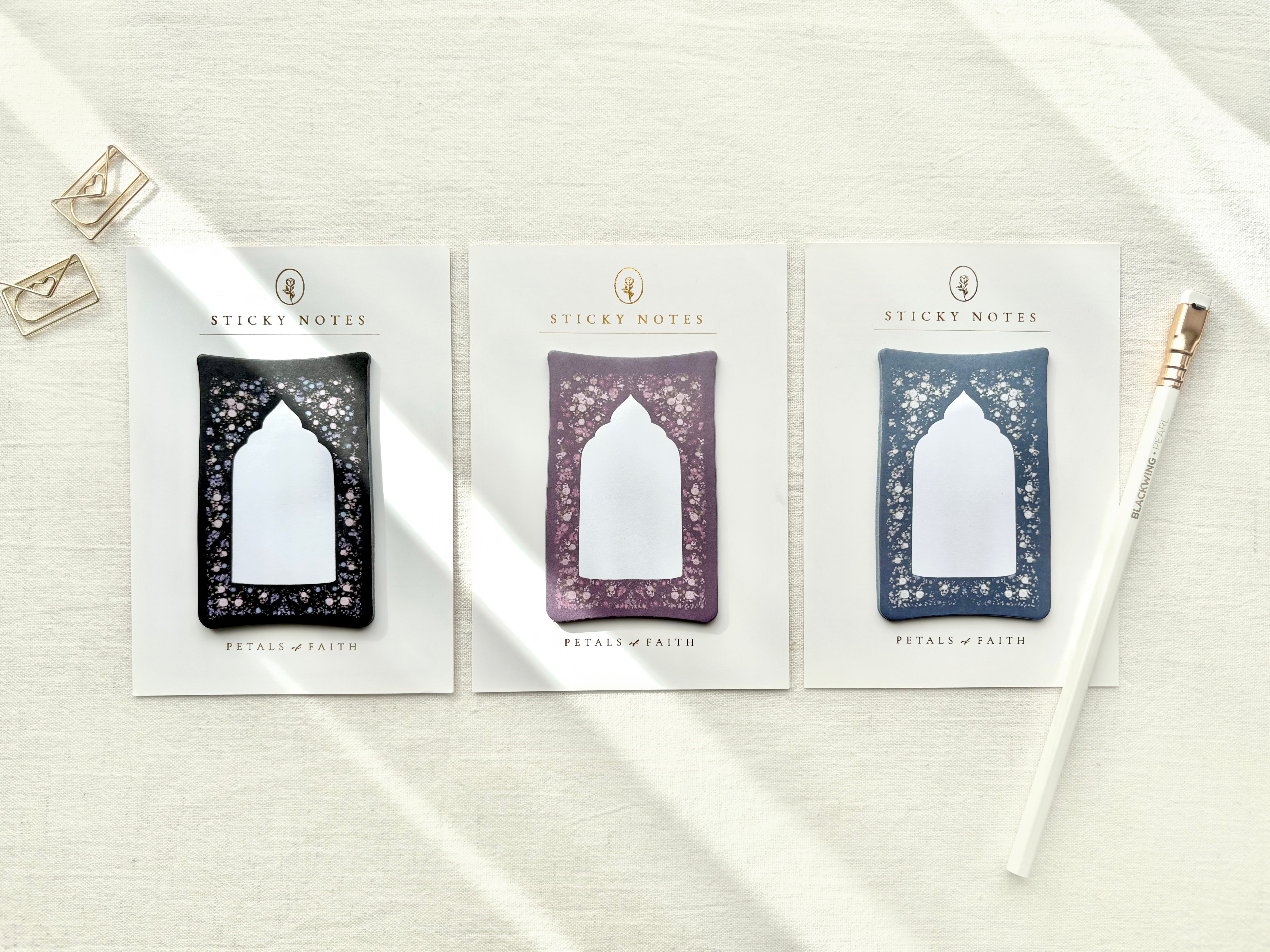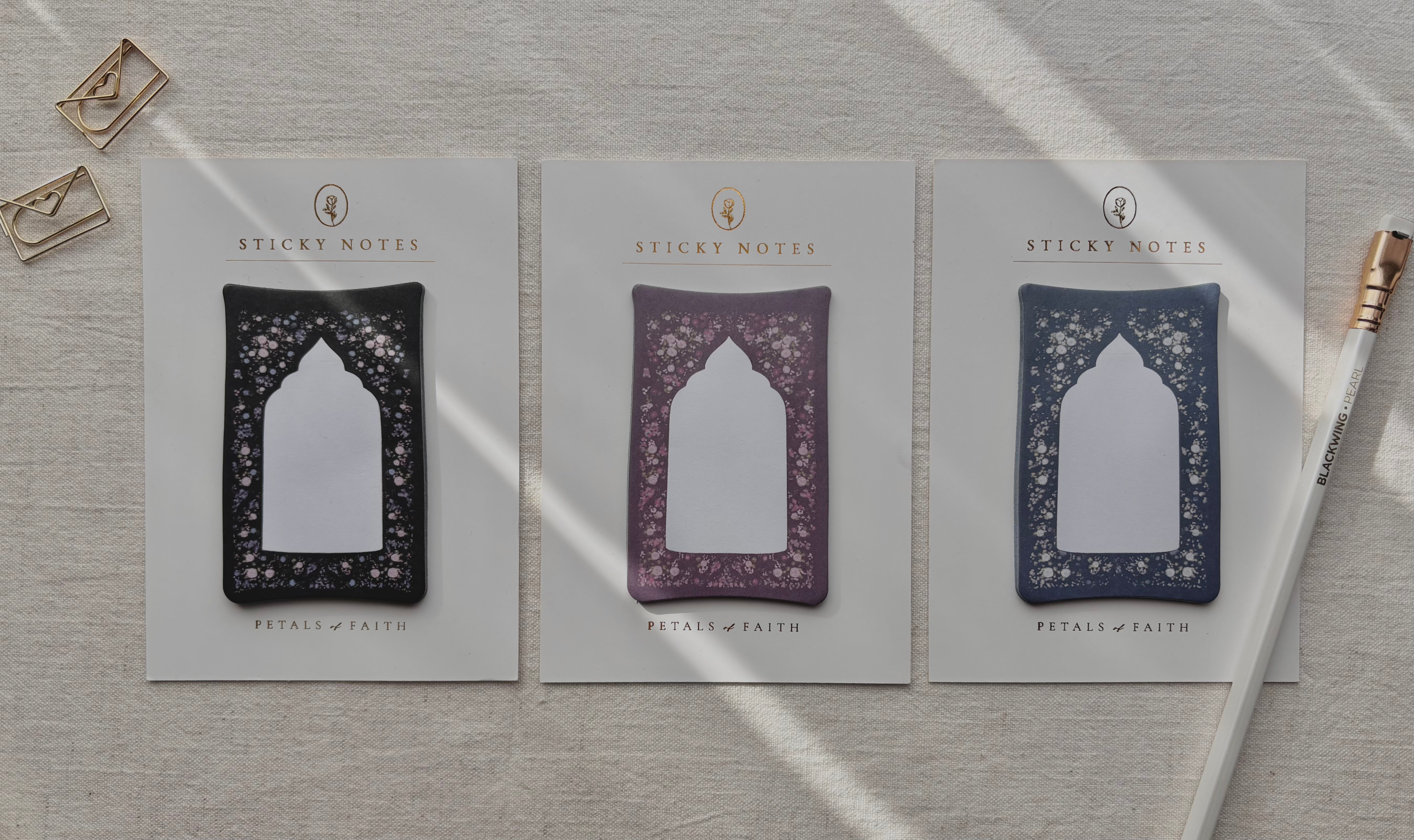 A beautifully illustrated set of 3 sticky note pads shaped like prayer mats, in soft mauve, black, and blue tones. Each features delicate floral details and a unique silhouette - perfect for highlighting special notes, duʿāʾs, or quotes.